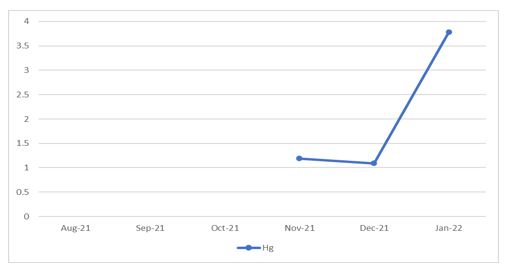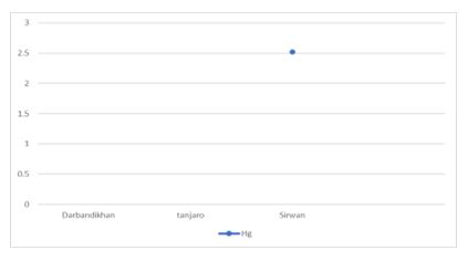 Table 9 displays the levels of Mercury across all months and locations studied, with exceptions for certain months and locations. Cd was notably higher in Tanjaro in August 2021, Pb in Sirwan in September 2021, Cu in Sirwan in November 2021, and Co in Tanjaro in October 2021. Cr was below detectable levels in all months and locations.