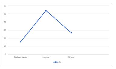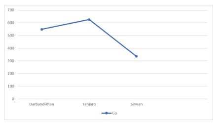 In Table 5, Cr was undetected across all locations, and no significant differences were observed for Cd, Pb, and Co. Cu levels were notably higher in the Sirwan location. In Table 6, Cr was not detected in any locations. No significant differences were observed for Cd and Pb. Co levels were higher in both Darbandikhan and Tanjaro. Cu was significantly elevated in the Sirwan River. Chart 10 displays the concentration of Co in parts per billion (ppb) in fish meat.