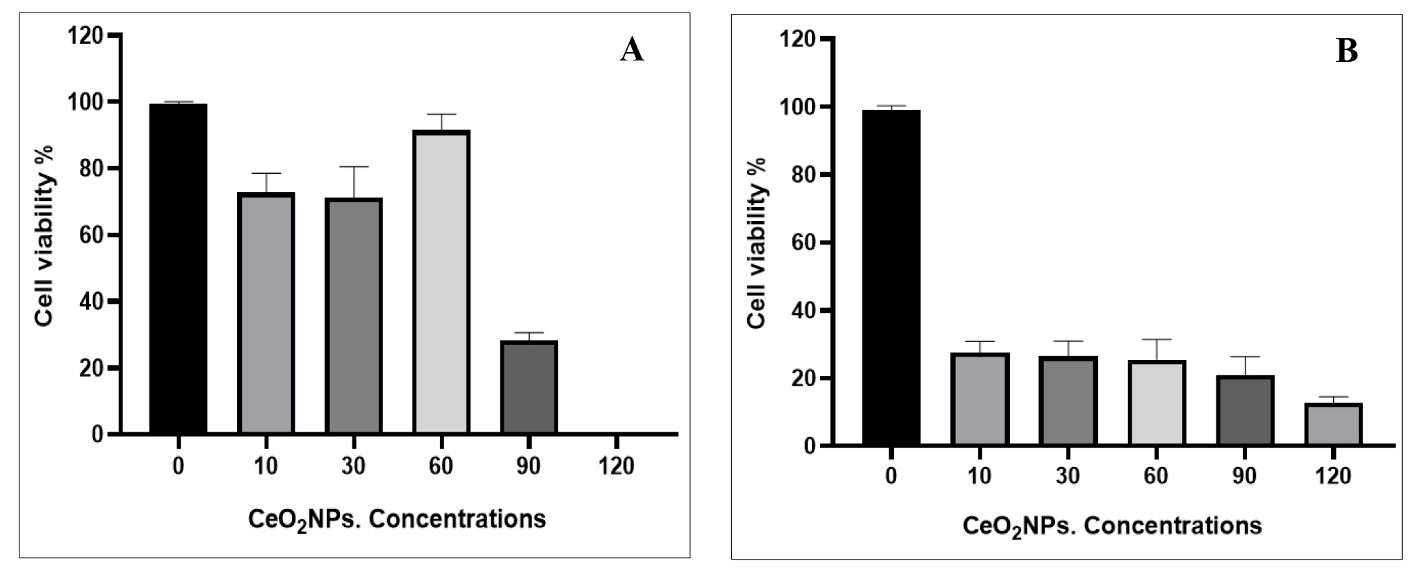 Figure 1.The percentage of the cell viability rate of the: A: HBL-100, B: REF cell lines, that were treated with different concentrations of nanoceria for 72 h. by using the MTT assay.
