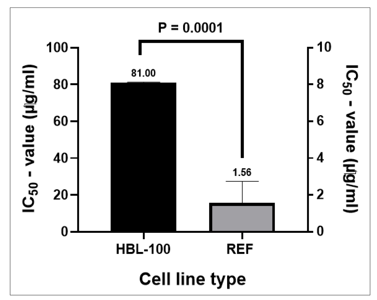 Figure 3.The result of T-test analysis between IC50 value of the HBL-100 and REF cell lines, were treated with different concentrations of nanoceria for 72 hours by using the MTT assay which calculated by GraphPad prism 8.1