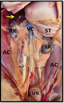 Figure (1).abdominal cavity in dog show the right kidney (RA).left kidney (LK).and liver yellow raw (L).stomach(S). urinary bladder (UB). Abdominal cavity (AC) vein cava(VC).
