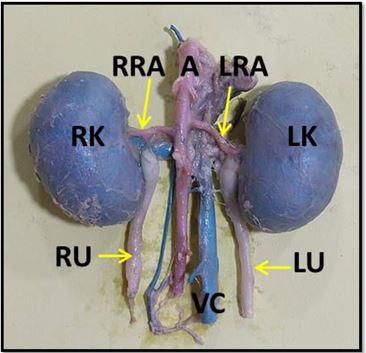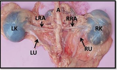 The kidneys are supplied via the left and right renal arteries, which branch off the abdominal aorta. The right renal artery leaves the abdominal aorta before the left renal artery. The right renal artery is longer than the left. The renal arteries divide into dorsal and ventral branches when they enter the kidney. The result of the study is similar to (20) .(21) . According to the literature, the renal arteries emerged from the abdominal aorta on both sides. The dorsal and ventral branches of the renal arteries were separated (4) (17) . Two interlobar arteries were sent to the ventral surface from the dorsal branch, while one was sent to the dorsal surface from the ventral branch. (20 , 22).
