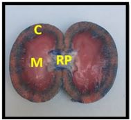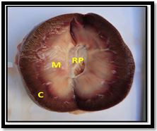 Figure (6).longitudinal section of kidney in dog. Cortex(C), medulla(M) renal pelvis (RP).