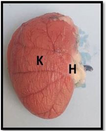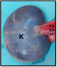 The renal medulla is characterized by two distinct zones: an outer layer that appears darker and an inner layer that is noticeably lighter. Surrounding this medulla is the renal cortex, which exhibits a reddish-brown hue. The findings of this study align with the observations made by (18) . Thus, the renal cortex stands out with its reddish-brown color, contrasting with the two-toned zones of the renal medulla-one dark and the other paler.The kidneys are sheltered by two protective layers of fat, which serve as an extra line of defense. Meanwhile, the fibrous renal capsule envelops these organs, supporting their sensitive tissues. (13) reported similar observations in ruminants, noting that this fatty layer can sometimes entirely obscure the kidneys. As a protective barrier, the fat cushions the body against the compressive pressures from neighboring organs. As explained by (4) , adipose tissue wraps around the slopes and sides of the kidneys. Consistent with the studies conducted by (4) and (19) , a clearly defined ureter can be seen prominently emerging from the center of the kidneys' unique renal pelvis.