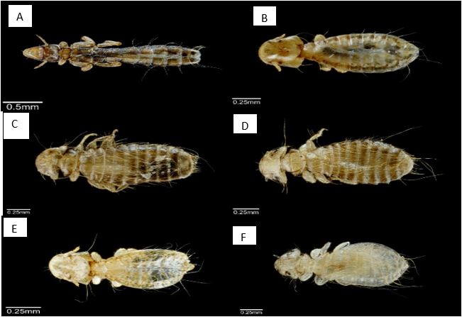 Figure 1.The species of chewing lice that recoded in the study. (A) Columbicola columba (B ) Campanulotes bidentatus (C) Mencanthus stramineus (D) Menopon gallina , (E) Menacanthus cornutus , (F)Hohorstiella lata .