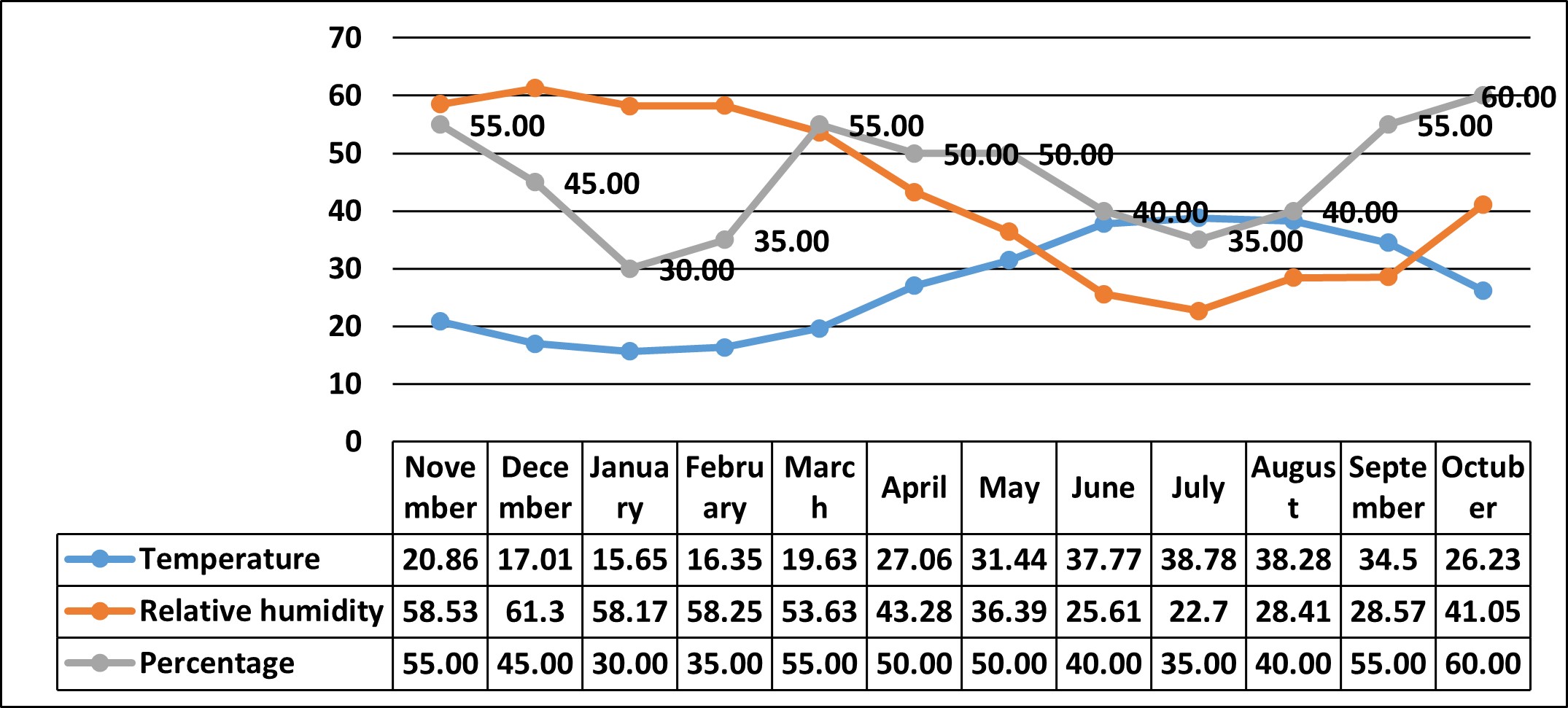 Some environmental factors were measured monthly during the period of study including temperature and relative humidity. The results of the statistical analysis showed significant differences in temperature and relative humidity with the percentages of chewing lice in the months at the level of significance P<0.05 as shown in Figures (4).