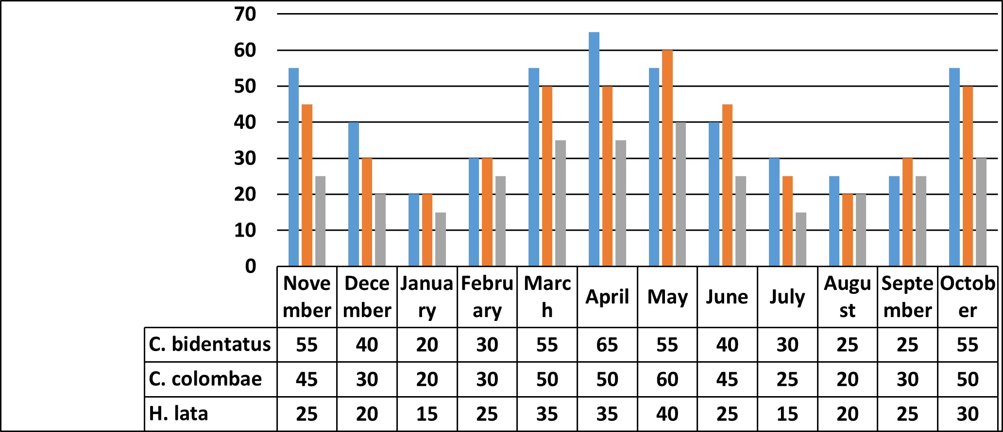 In domestic pigeons, Figure (5) shows the monthly distribution of the species of lice on domestic pigeons. The species C. bidentatus recorded the highest percentage in April with 65%, and the lowest was in January at 20%. C. columbae recorded the highest percentage in May with 60%, and the lowest was in January and July at 20%. While H. lata recorded the highest percentage in May with 40%, and the lowest was in January at 15%. The results of the statistical analysis showed significant differences in incidence rates during the months of the study. Figure 6 shows the number of lice isolated from each species infesting pigeons during the study period.