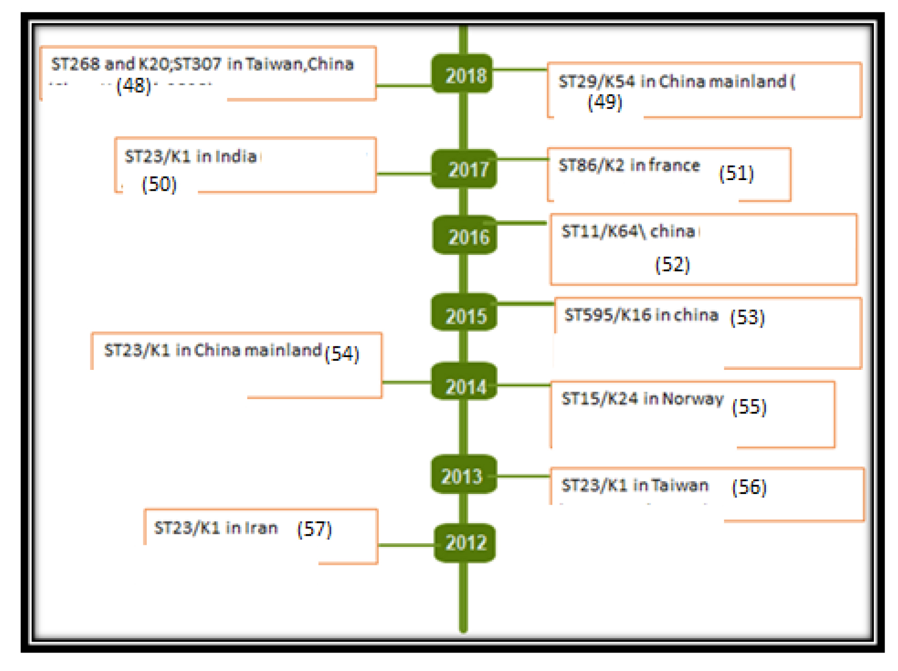 - Surgers, L., Boyd, A., Girard, P. M., Arlet, G., & Decré, D. (2016). ESBL-producing strain of hypervirulent Klebsiella pneumoniae K2, France. Emerging infectious diseases, 22(9), 1687. https://doi.org/10.3201/eid2209.160681.DOI