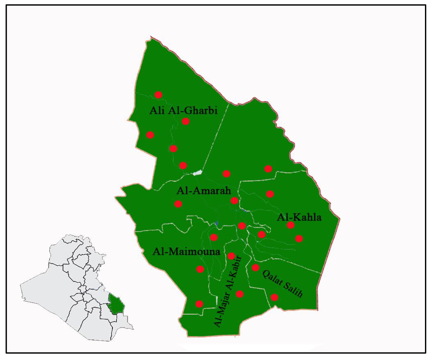 The present study comprised 174 animals, including 98 sheep and 76 goats (44 males and 130 females) in different age groups. All the animals were infested with ticks. Data documentation included the type of animal, age, and gender. The study included various rural and urban areas in Maysan Province, southern Iraq, covering the regions of Al-Amarah, Al-Kahla, Al-Majar Al-Kabir, Al-Maimouna, Ali Al Gharbi, and Qalat Salih (Figure 1).
