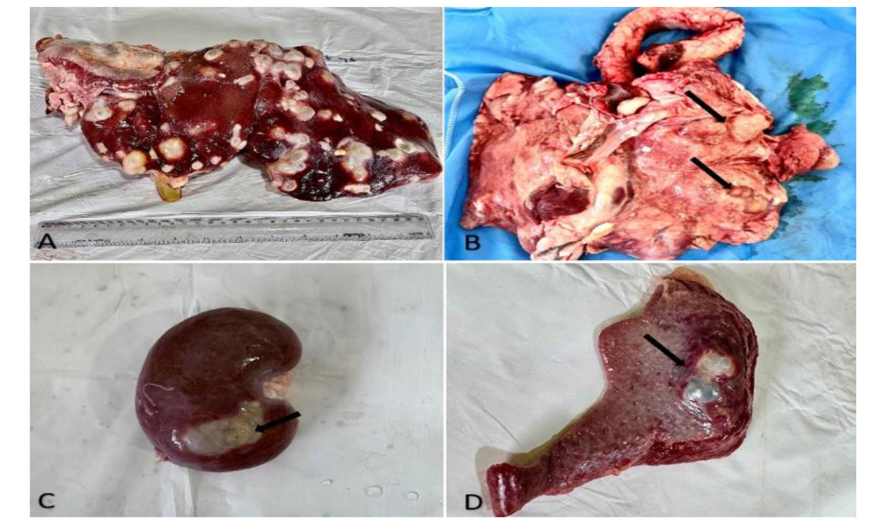 Figure 1.Gross lesions of hydatid cysts in organs of infected sheep and goats. A) Infested livers with different sizes and shapes (Bulged and embedded) of cysts. B) Infected lung with multiple cysts. C) Infected kidney with a single irregular shaped cyst. D) Infected spleen with large cyst contains protoscoleces.