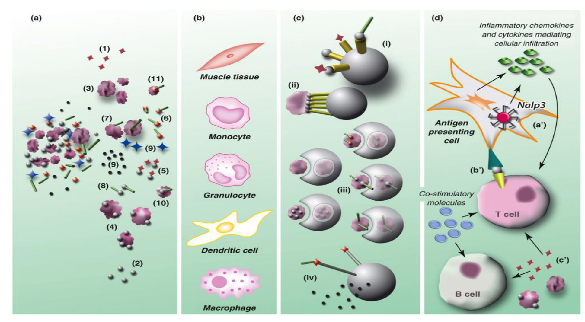 Figure 1.Innate and adaptive immunity, as well as the aluminum adjuvant armory. (a) A variety of possible agonists of the immune cascade are produced when the vaccine formulation is diluted into the muscle interstitial fluid (MIF), including: (1) Al3+(aq); (2) free antigen (AG); (3) particulate adjuvant (ADJ); (4) ADJ with associated AG; (5) AG-Al complex; (6) MIF ligand-Al complex; (7) ADJ with associated MIF ligand; (8) MIF ligand-AG complex; (9) particulate iron (as adjuvant contaminant), either free or with adsorbed Al/AG and the resulting reactive oxygen species (ROS); (10) ADJ with associated MIF ligand-AG complex; (11) ADJ with associated MIF ligand-Al complex. Biomolecules like ATP, albumin, transferrin, citrate, and fibrinogen may be MIF ligands. (b) A variety of cell types are affected by the array of agonists, including the resident muscle tissue (which may result in necrotic and/or apoptotic cell death) and infiltrating innate cells like monocytes (which may differentiate into dendritic cells due to AlADJ), granulocytes (which may cause AlADJ-induced eosinophilia that directly affects B cells), macrophages (which are known to remain near the injection site for extended periods of time and may be identified by AlADJ inclusions), and dendritic cells (DC). The latter could be the main APC that presents antigens. (c) Aggressors and innate cells can interact in a variety of ways, such as (i) AG2, AG-Al complex5, MIF ligand-AG complex8, and Al3+(aq)1 binding to toll-like receptors (TLRs); (ii) AG-ADJ4 binding to multiple TLRs; (iii) phagocytosis of ADJ3, AG-ADJ4, MIF ligand-ADJ7, MIF ligand-Al complex-ADJ11, and MIF ligand-AG complex-ADJ10; (iv) direct1 or indirect6 binding of Al3+(aq) by membrane receptors and extracellular (lipid membrane) or intracellular (nucleus) ROS9. (d) APCs trigger adaptive immunity by (a) releasing chemokines and cytokines (green saucers) like IL-1b and IL-18 either independently or dependently on the Nalp3 inflammasome; (b) presenting AG to the T cell receptor via MHC in conjunction with co-stimulatory molecules; and (c) directly acting on B/T cells with ADJ and/or Al3+(aq). The figures' parenthetical numbers are indicated by the superscripts (10).