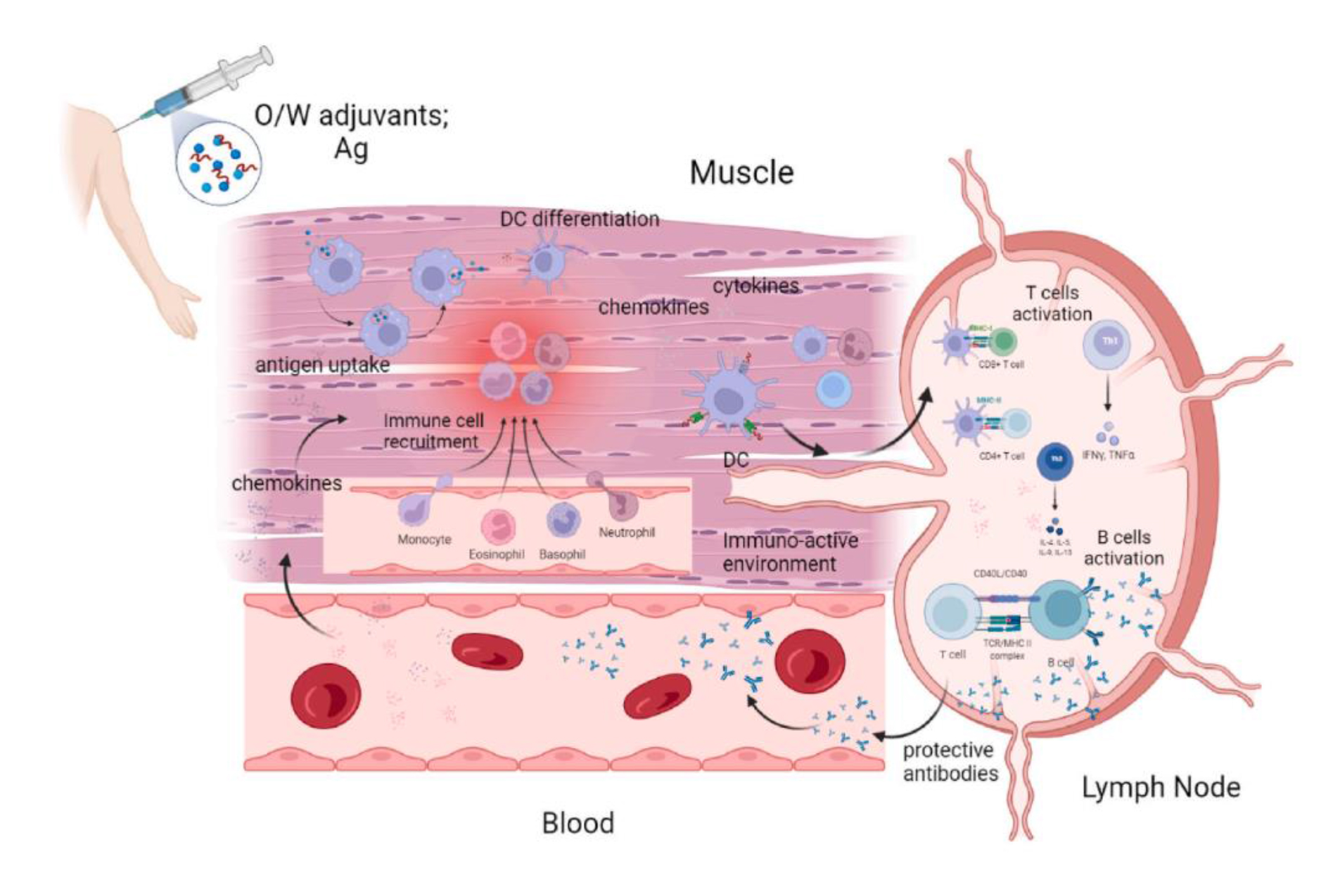Fig. 3.The likely way that oil-in-water emulsions work. The oil-in-water emulsion produces an immunologically active milieu at the injection site after intramuscular injection. Chemokines cause a huge number of innate immune cells, including monocytes, dendritic cells, eosinophils, and neutrophils, to be drawn to the draining lymph nodes. Th1 and Th2 type cytokines and particular antibodies are produced when T and B cells are activated by DCs harboring antigenic signals within the draining lymph nodes. After entering the bloodstream, the particular cytokines and antibodies start to have a protective effect (30).