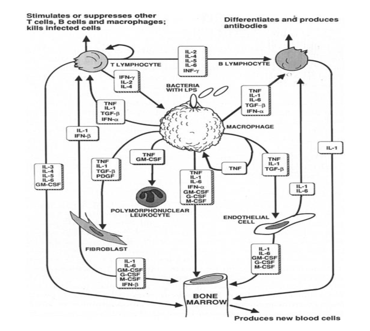 Figure 4.When an LPS-stimulated macrophage (middle) secretes mediators, it triggers further secretory stimuli and physiologic consequences from a variety of cell types. The effects of tumor necrosis factor (TNF), interleukin (IL)-l, IL-2, IL-4, IL-5, and IL-6, growth factor (TGF-~), and interferon-y (IFNy) on the proliferation and differentiation of T and B lymphocytes—two essential components in the antigen presentation process—are of particular interest for adjuvant development for vaccines. updated and informed by new information (40).