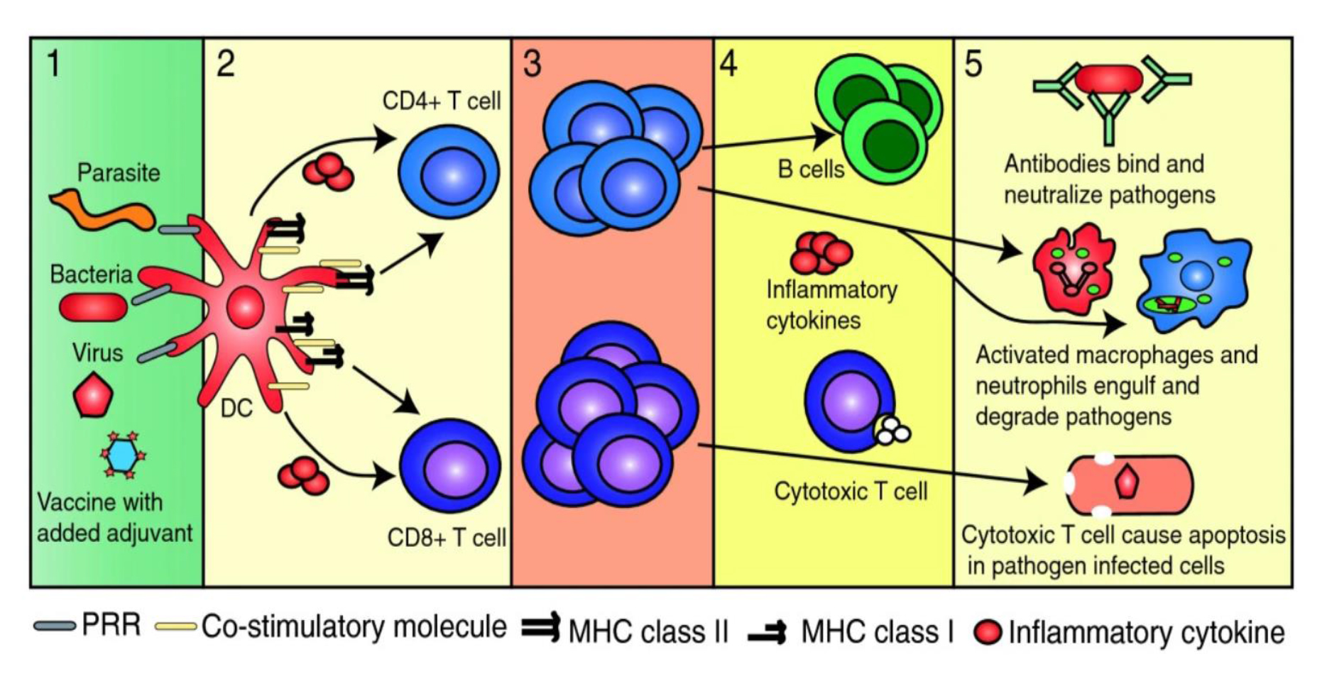 To mount an efficacious immunological reaction, B cells are required to produce about 20,000 plasma cells, and also T-lymphocytes are expected to induce a cell-based reaction ( 24 ). Further, current adjuvants can produce adequate B cells yet insufficient CD8 T cells. The coupling of adjuvants is necessary to induce sufficient T cell reactions ( 25 ).